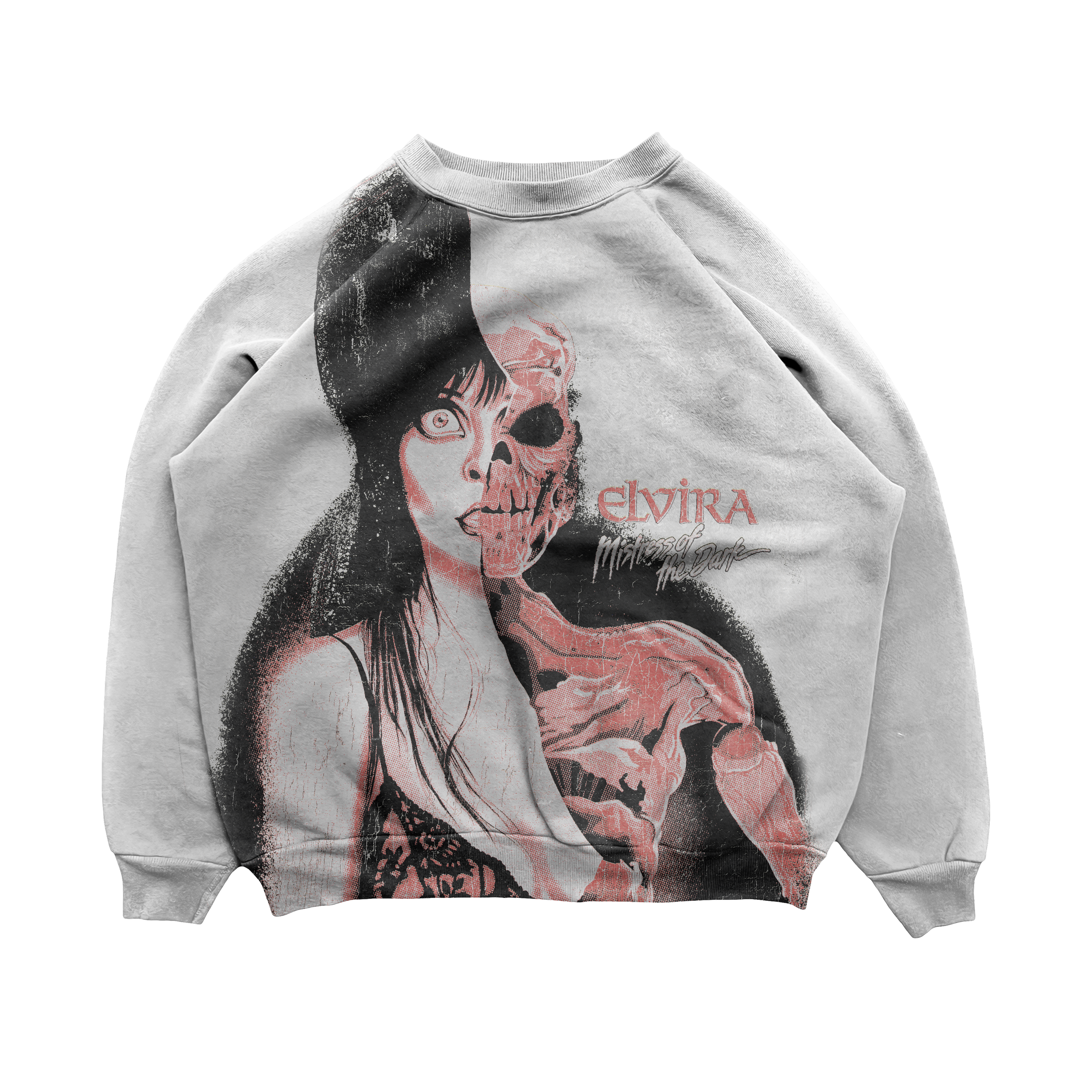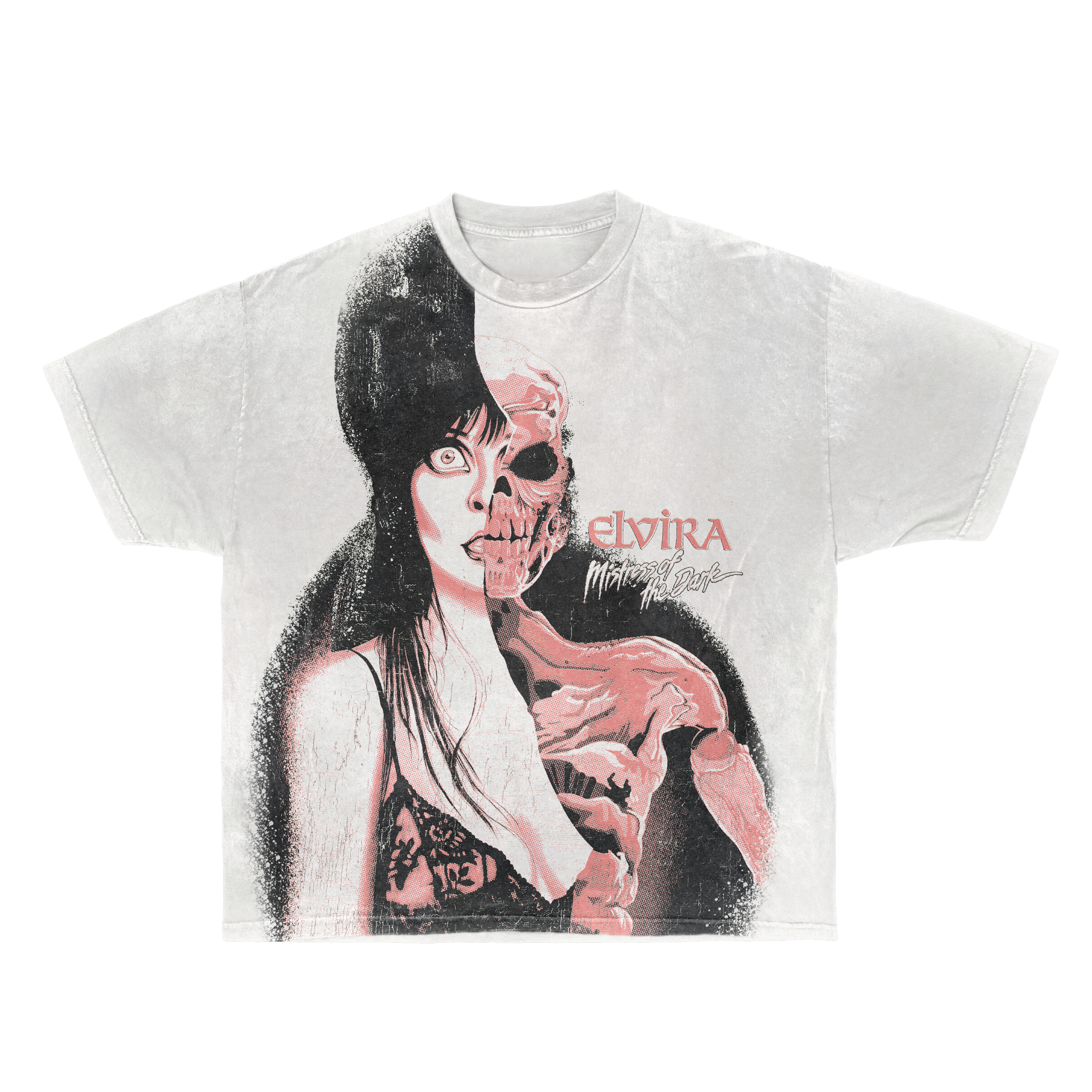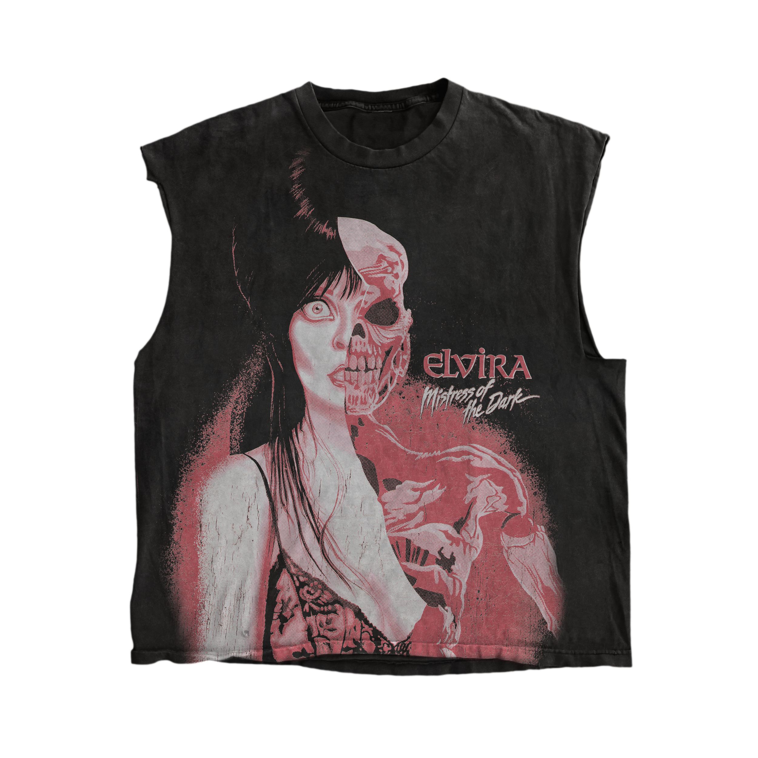 One t-shirt (two colors), one tank top (two colors), one sweatshirt (two colors), and one poster using a digital painting inspired by Elvira.